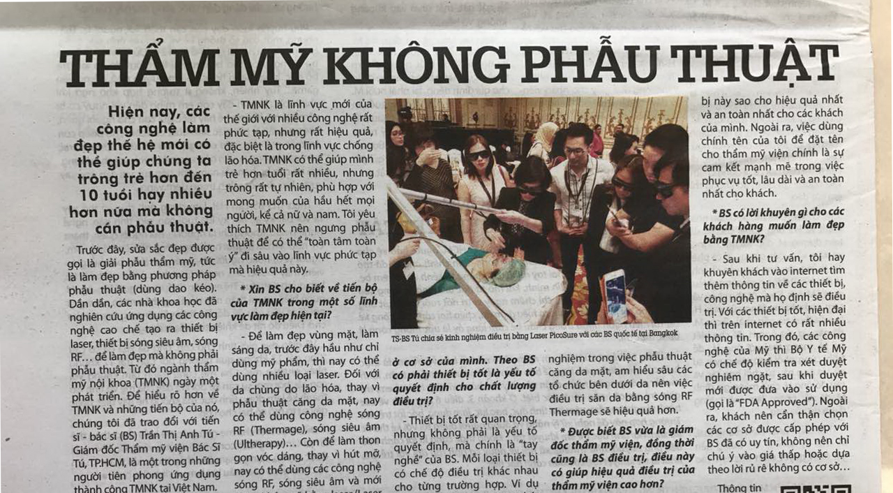 Trước đây, sửa sắc đẹp được gọi là giải phẫu thẩm mỹ, tức là làm đẹp bằng phương pháp phẫu thuật (dùng dao kéo). Dần dần, các nhà khoa học đã nghiên cứu ứng dụng các công nghệ cao chế tạo ra thiết bị Laser, thiết bị sóng siêu âm, sóng RF… để làm đẹp mà không phải phẫu thuật. Từ đó ngành thẩm mỹ nội khoa (TMNK) ngày một phát triển. Để hiểu rõ hơn về TMNK và những tiến bộ của nó, chúng tôi đã trao đổi với Tiến sĩ Bác sĩ Trần Thị Anh Tú - Giám đốc Thẩm Mỹ Viện Bác Sĩ Tú, TP.HCM, là một trong những người tiên phong ứng dụng thành công thẩm mỹ nội khoa tại Việt Nam.