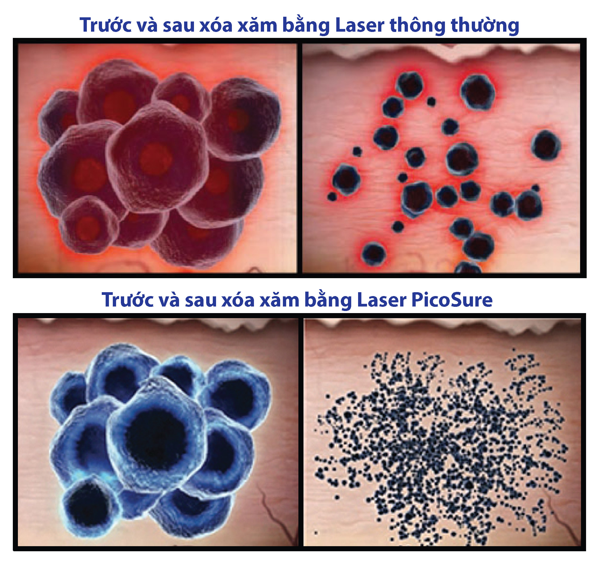 Về tiến bộ công nghệ Laser thẩm mỹ: mới đây, các nhà khoa học Mỹ vừa phát minh và đưa ra loại Laser thế hệ mới với độ rộng xung siêu ngắn tính tới phần nghìn tỉ giây (picosecond – pico giây), trong đó loại nổi bật nhất là Laser “PicoSure”. Laser PicoSure là công nghệ mới nhất có tính cách mạng trong việc xóa sắc tố, trẻ hóa da bằng Laser. Tia Laser PicoSure có xung cực ngắn tính đến đơn vị phần nghìn tỉ giây, ngắn hơn cả công nghệ Q-Switch (phần tỉ giây)! Laser với xung cực ngắn khi tác động vào sắc tố sẽ tạo ra tác động từ quang sang cơ mạnh mẽ, (thay vì từ quang sang nhiệt), tạo ra hiệu ứng sóng nén, làm phân hủy mạnh các sắc tố thành những mảnh cực nhỏ, từ đó cơ thể mau hấp thụ và đào thải ra ngoài, làm giảm nhanh sắc tố, đồng thời giảm tổn thương cho các mô lân cận. Điều này đã giúp xóa xăm, xóa sắc tố hiệu quả cao (với số lần cần xóa ít hơn), có thể xóa được các loại mực “cứng đầu” và các màu xăm khó trước đây khó xóa được, đồng thời bảo vệ da tốt hơn so với công nghệ trước đó (do ít tạo ra nhiệt hơn).