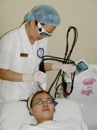 - Xóa sẹo mụn: Đối với sẹo mụn đã hình thành, đề xóa các sẹo mụn này đồng thời hạn chế tác dụng phụ, gần đây các nhà khoa học đã nghiên cứu và đưa ra công nghệ laser “Fractional” (tạm gọi là laser “chùm tia cực nhỏ”), với ưu điểm tác động nhiệt vào da theo từng điểm nhỏ li ti – thay vì nguyên diện tích da – để hạn chế tác dụng phụ. Do vùng da giữa những điểm chiếu li ti không chịu tác động của laser nên việc lành vết thương ở những điểm chiếu li ti diễn ra nhanh, đỏ da ở mức độ nhẹ. Phương pháp này được dùng để xóa sẹo, xóa nhăn, điều trị lão hóa da…