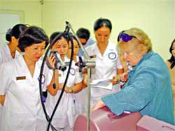 | Chuyên gia Hoa Kỳ (bên phải) đang huấn luyện cho bác sĩ thẩm mỹ VN về vận hành máy laser Vbeam |