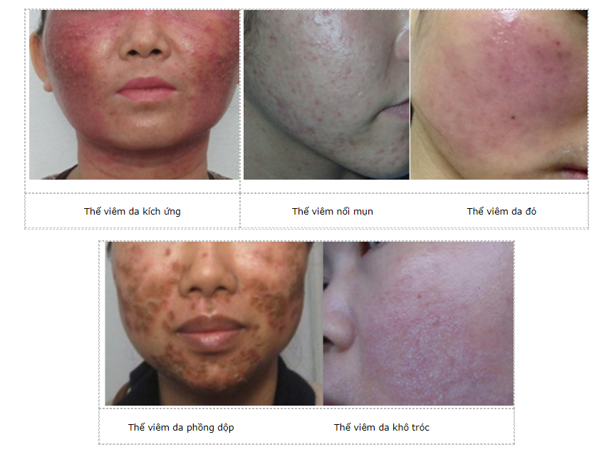 1.Thể Viêm da kích thích: Đây là thể rất nặng và cấp tính do dùng các loại corticoid mạnh và độc tính cao.Triệu chứng rất khó chịu làm cho người bênh đứng ngồi không yên, biểu hiện bằng triệu chứng ở những vùng đã bôi sản phẩm chứa corticoid :